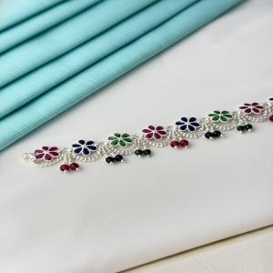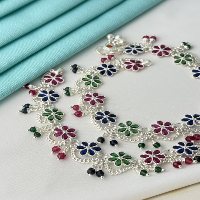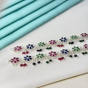 “Rainbow Blossom Silver Anklet - Brighten up your steps with this playful Rainbow Blossom Silver Anklet, adorned with vibrant enamel floral motifs in red, blue, and green. Each flower is complemented by delicate dangling beads, adding charm and movement to the design. Perfect for festive occasions, weddings, or daily wear, this anklet brings a youthful and lively touch to your jewellery collection.