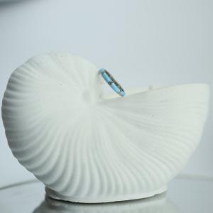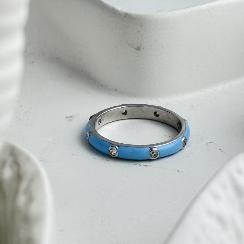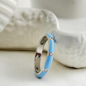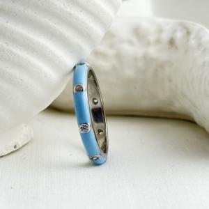 "Azure Elegance Enamel Band: It captures modern sophistication with a refreshing pop of color. This stunning piece features a smooth sky-blue enamel finish, accented by evenly spaced bezel-set crystals that add a subtle sparkle. Its sleek, contemporary design makes it perfect for everyday wear while still exuding a touch of luxury. The ring’s polished silver-tone edges frame the enamel beautifully, offering a harmonious blend of bold color and refined craftsmanship."