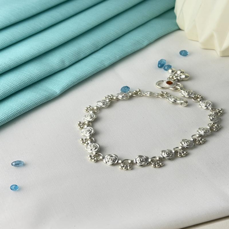 "Rosalia: where silver meets the timeless beauty of roses." Anklet designed for your loved one's seamlessly connected through roses for graceful and elegant look. Perfect for daily wear or gifting, made with hallmarked silver for purity and quality. Our product is also 100% Cadmium free, anti-tarnish, making it completely safe for your skin.